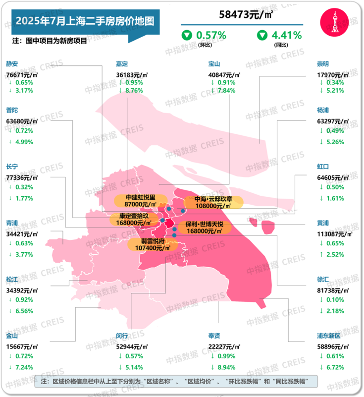 图:2025年7月上海各市辖区二手住宅挂牌均价及环同比