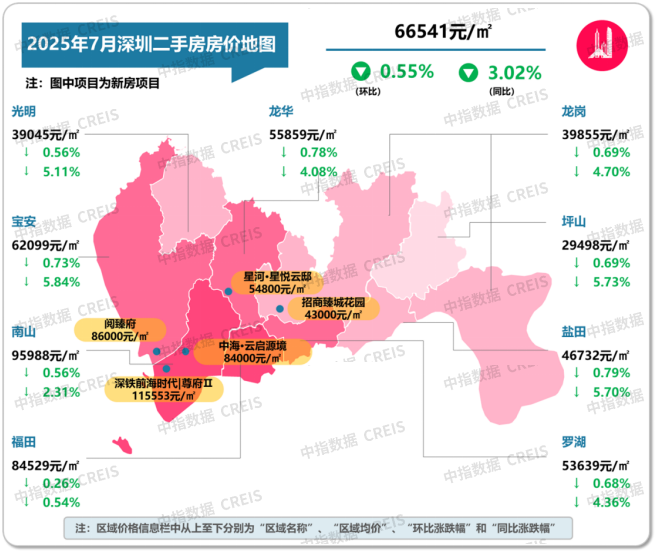 图:2025年7月深圳各市辖区二手住宅挂牌均价及环同比