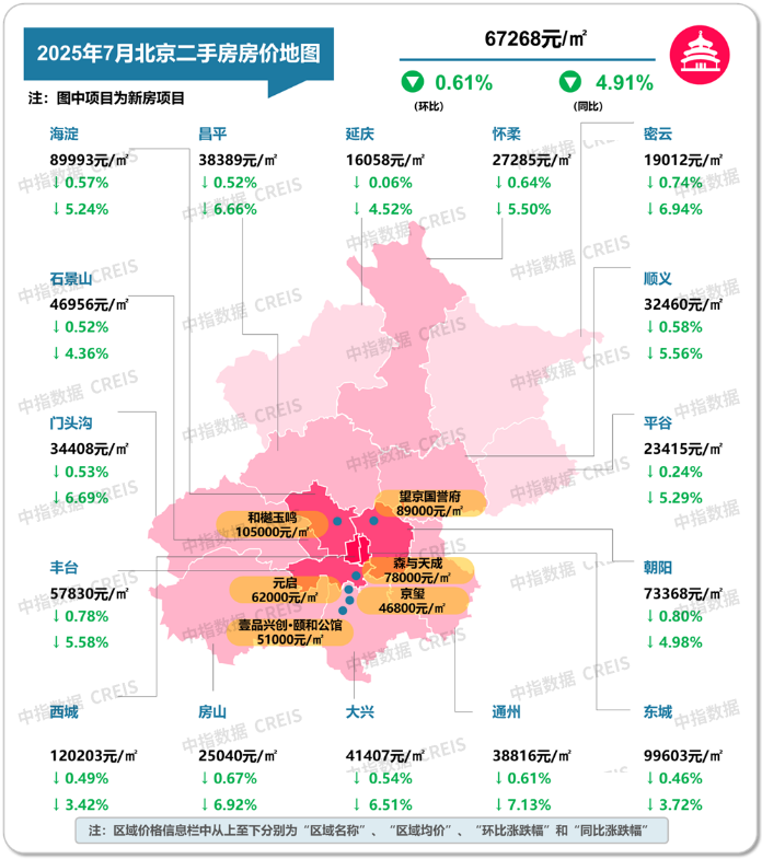 图:2025年7月北京各市辖区二手住宅挂牌均价及环同比