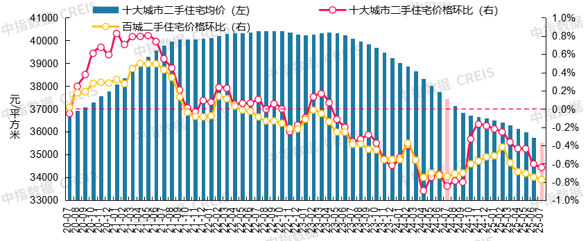 图:2020年7月至2025年7月十大城市二手住宅均价及环比变化