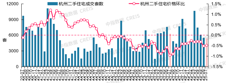图:2020年7月至2025年7月杭州二手住宅成交套数及二手住宅价格环比走势